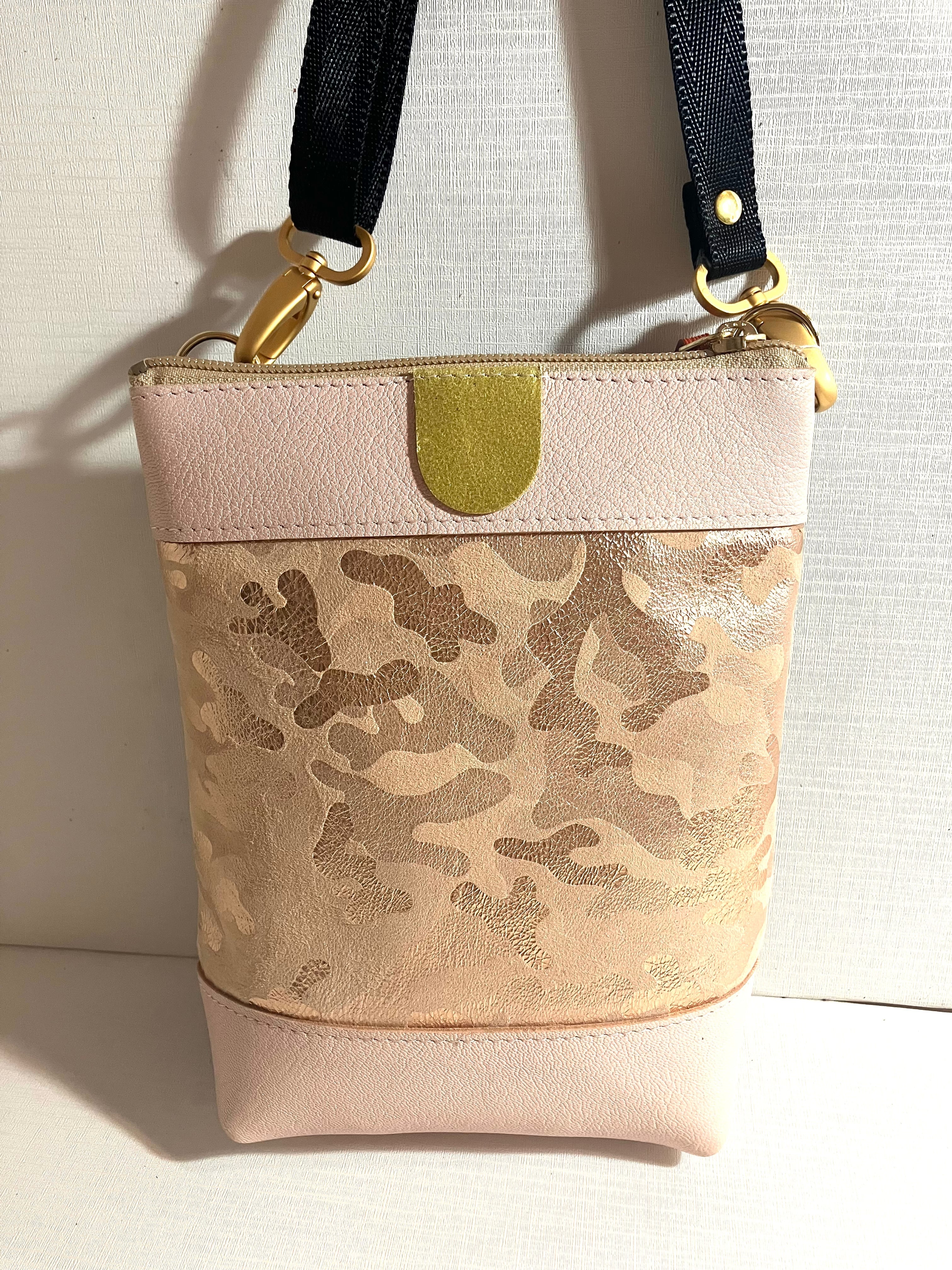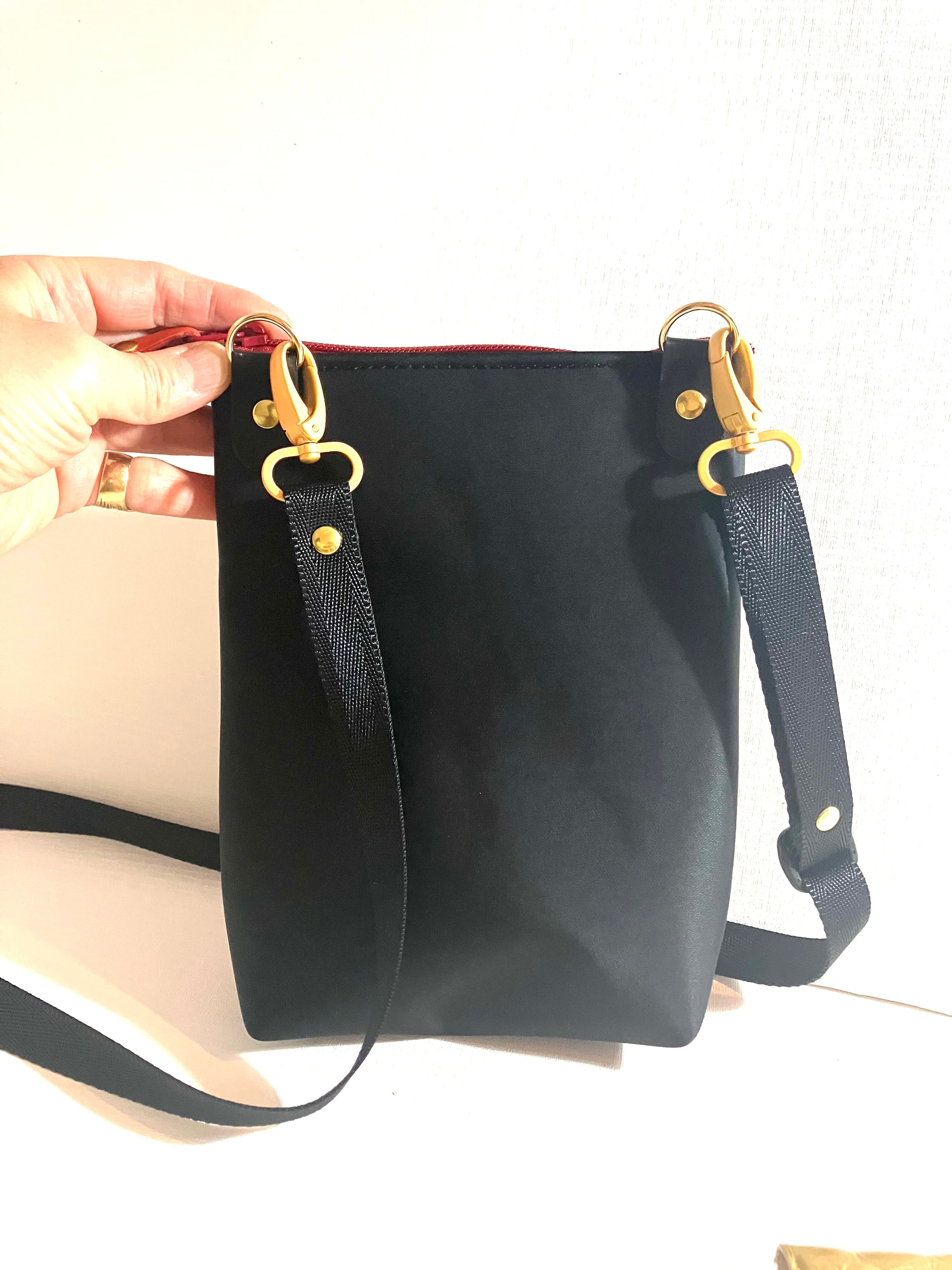 前面に牛皮、背面に黒の防水ナイロンを使っています